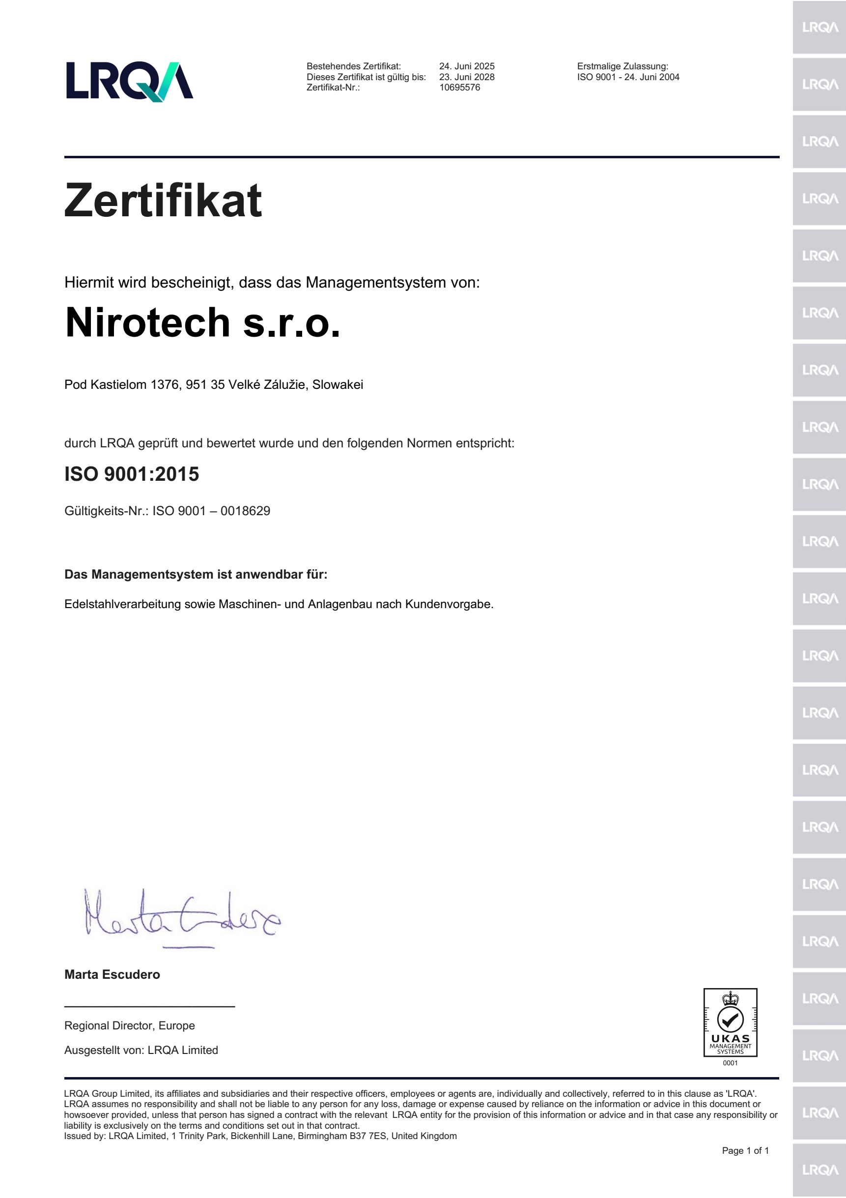 Die Zertifizierung nach ISO 9001:2015 ist für uns als Unternehmen von zentraler Bedeutung. Sie bestätigt, dass unser Qualitätsmanagementsystem den höchsten internationalen Standards entspricht und unsere Prozesse, Verfahren und Produkte kontinuierlich verbessert werden. Durch die Zertifizierung können wir unseren Kunden die hohe Qualität unserer Produkte und Dienstleistungen garantieren. Unser Fokus liegt auf kontinuierlicher Verbesserung und Kundenzufriedenheit, wodurch wir auch in Zukunft den sich ständig ändernden Bedürfnissen und Anforderungen unserer Kunden gerecht werden können. Die ISO 9001:2015 Zertifizierung ist ein wichtiges Instrument, um sicherzustellen, dass wir als Unternehmen unseren Kunden ein hohes Maß an Qualität und Zuverlässigkeit bieten und unsere Geschäftsprozesse kontinuierlich optimieren.